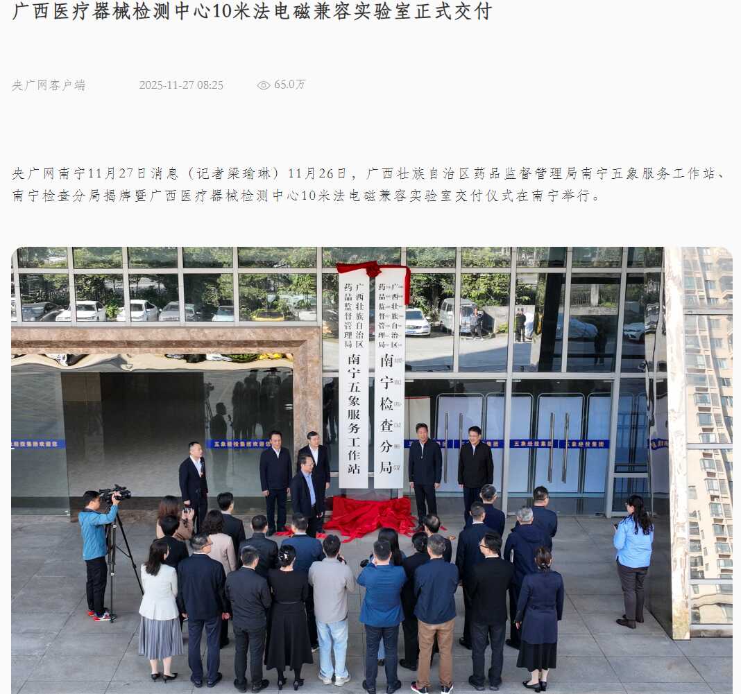 央广网南宁11月27日消息(记者梁瑜琳)11月26日,AG百家乐南宁五象服务工作站、南宁检查分局揭牌暨广西医疗器械检测中心10米法电磁兼容实验室交付仪式在南宁举行。